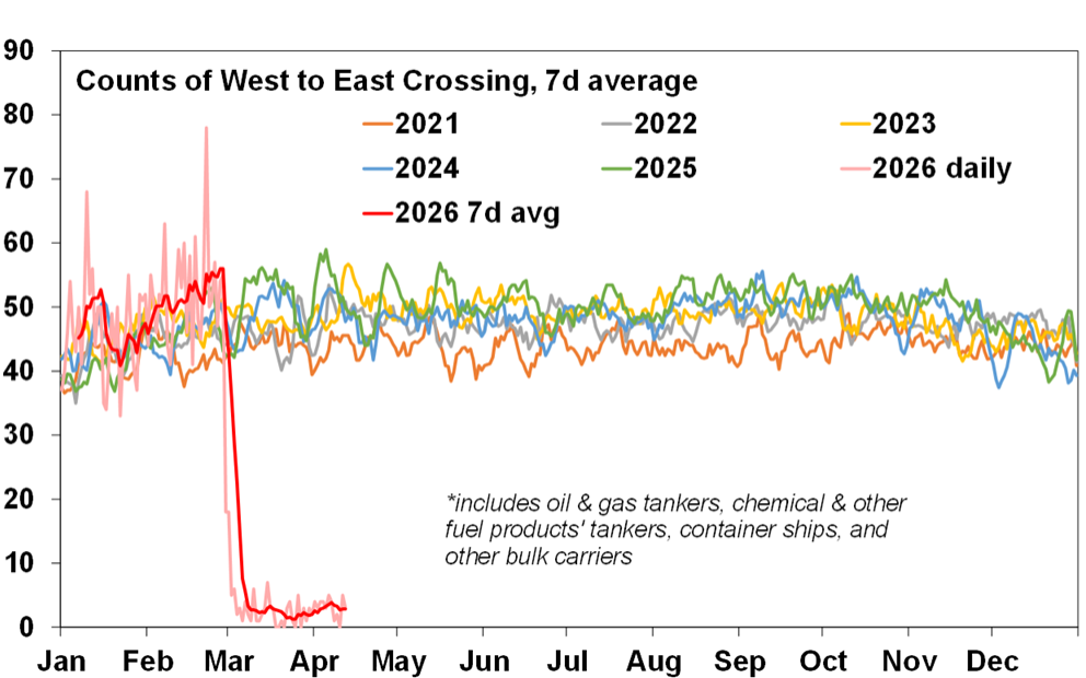 – A stagflationary hit of higher inflation and weaker growth is now baked in with the uncertainty being how long it’s sustained. The flow of ships through the Strait of Hormuz remains the key – as it has been since day one of the War.