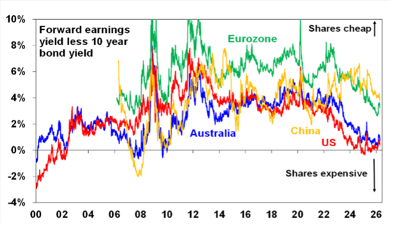 Finally, all of which runs the risk of more constrained and volatile investment returns. Which should mean that shares should be offering a higher risk premium over bonds. But at present the risk premium offered by US and Australian shares – as measured by the forward earnings yield less 10-year bond yields – remains very low.